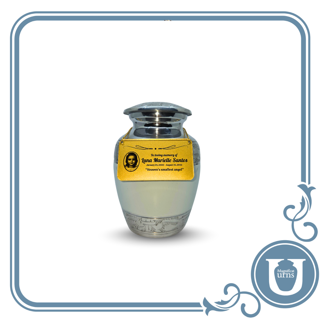 This nameplate may be personalized with the individual’s name, life dates, a short message, and an engraved photograph, creating a meaningful keepsake that preserves cherished memories. Its elegant design and proportionate size make it ideal for adult urns, vaults, or memorial displays.