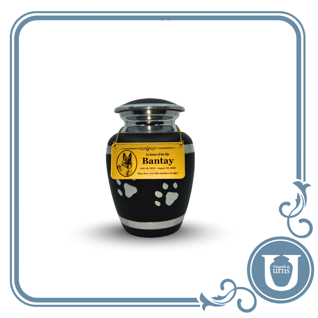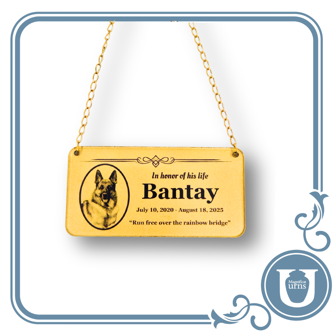 The Pet Size Memorial Nameplate is a thoughtfully designed tribute that honors the life and legacy of a loved one. Crafted with a premium gold-finish plate and paired with a durable hanging chain, it offers a timeless and respectful memorial suitable for various remembrance settings.